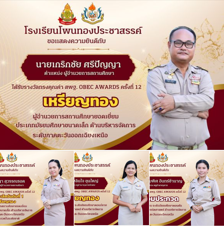 ขอแสดงความยินดีกับ ผู้บริหารและครู สังกัดโรงเรียนโพนทองประชาสรรค์ ที่ได้รับรางวัลทรงคุณค่า สพฐ. OBEC AWARDS ครั้งที่ 12